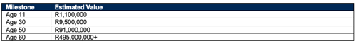 - Growth during this period: Because the market compounds as you add money, the account value by age 11 wouldn't just be R500k; with 12% growth, it would be approximately R1.1 Million.