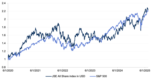 The South African equity market also performed impressively in the period, reaching all-time highs of its own, returning around 19% since Trump’s tariff turmoil began. Combined with the relative strengthening of the rand to the dollar, this has allowed the JSE All Share index to outperform the S&P500 over the last 5 years in dollar returns.