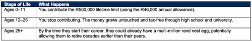 The real magic happens because a child has a 50- to 60-year investment horizon. If you maximize their contributions early, you can hit their R500,000 lifetime limit by the time they are roughly 11 or 12 years old.